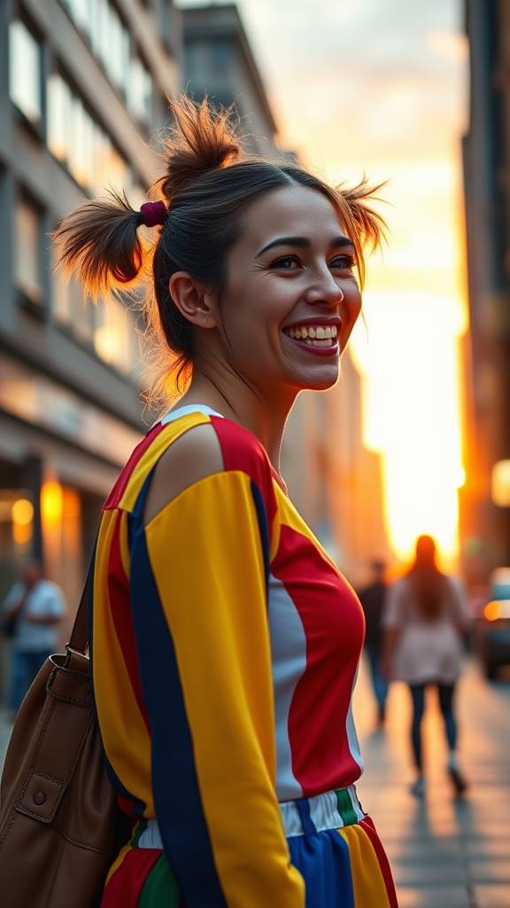 A joyful woman with cute pigtails, dressed in a colorful harlequin outfit, strolls through the city at sunset, her face lit up with a radiant smile. The scene captures her in a side view, showcasing her cheerfulness, as volumetric light filters through the surroundings. Imagine this moment frozen in time, like a charming Polaroid snapshot, with the vibrant hues of the setting sun adding warmth to the cityscape.