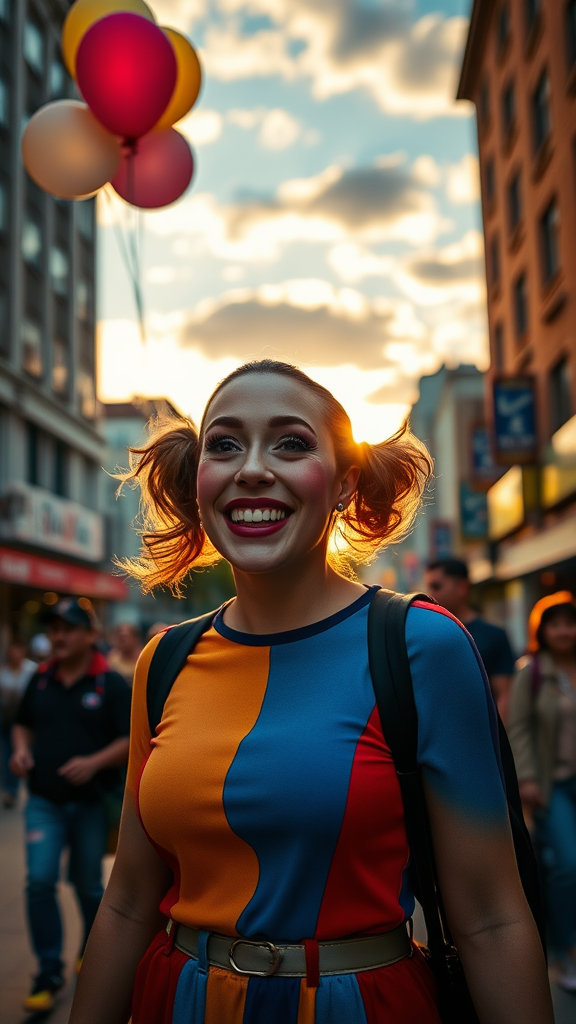A joyful woman with vibrant, colorful makeup reminiscent of a clown and dressed in a playful harlequin-patterned outfit strolls through the bustling city streets. Her hair is styled in cute, bouncy pigtails, and she exudes an infectious happiness, her warm smile lighting up the scene. The sun begins its descent, casting a golden glow against the partially clouded skies, creating a beautiful backdrop. Balloons drift playfully in the sky behind her, adding a touch of whimsy. The scene is captured in a side view, with rich, warm tones reminiscent of Kodak Portra 800 film, and the volumetric lighting enhances the enchanting atmosphere of the moment.