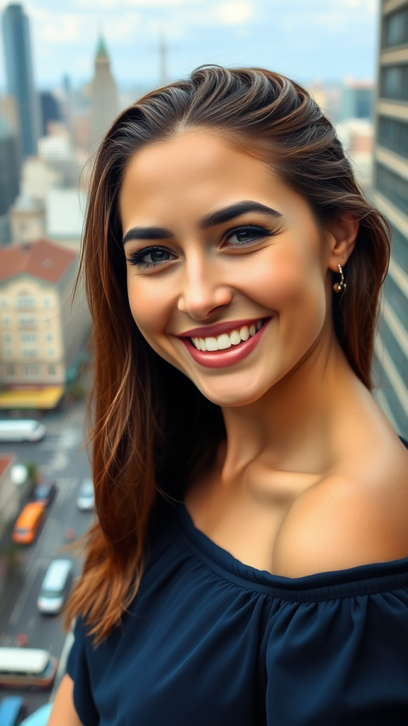 A joyful woman with wet, slicked-back chestnut hair cascading elegantly over one shoulder gazes directly at the camera, her friendly expression enhanced by a subtle head tilt. She wears an off-the-shoulder navy top, her natural makeup accentuating her features beautifully. Behind her, a bustling cityscape unfurls, capturing the essence of urban vibrancy.