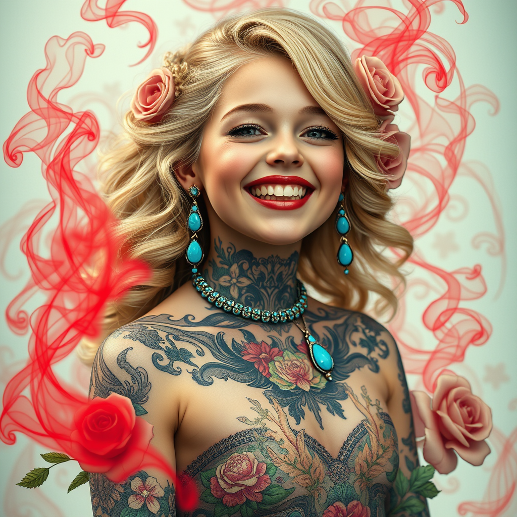 A joyful young blonde girl adorned in a mesmerizing cosmic dress, her full-body tattoos showcasing exquisite rococo and art nouveau motifs, intricately ornate and symmetrical. Her look is both elegant and hyper-realistic, with intricate detailing in pastel hues. She wears striking turquoise jewelry, enveloped by swirling red smoke and delicate roses. This hypermaximalist vision blends vintage charm with a grotesque beauty, creating a stunning and remarkable masterpiece that captivates the senses.