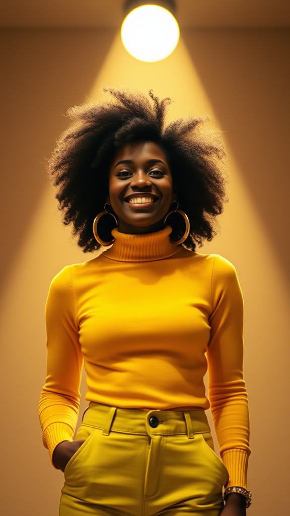 A joyful young woman with a rich dark skin tone and a voluminous afro hairstyle stands confidently. She's dressed in a vibrant yellow turtleneck sweater and stylish bell-bottoms with a subtle cyan tint. Her look is accentuated by large statement earrings that reflect the eclectic spirit of 1970s hip-hop fashion. The scene is captured with cinematic lighting that highlights high-frequency details, creating a striking masterpiece. Photographed using a 35mm film camera, the image features nostalgic film noise and the warm tones typical of Kodak ProImage 100, with a well-defined depth of field and beautiful bokeh that gives the portrait a timeless feel.