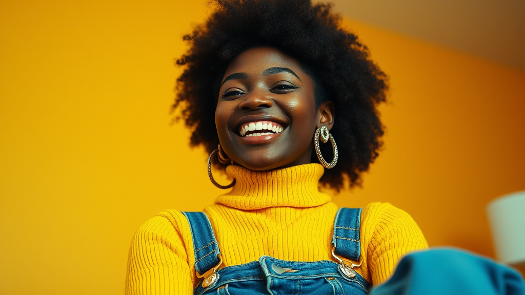 A joyful young woman with dark skin and a vibrant afro hairstyle beams with happiness. She's dressed in a bright yellow turtleneck sweater, exuding 1970s hip-hop vibes with large statement earrings that catch the light. Her bell-bottom jeans flare dramatically, adding to the retro aesthetic. The scene is bathed in cinematic lighting, capturing high-frequency details on 35mm film, reminiscent of the Kodak ProImage 100's unique grain and texture. The image has a rich yellow and cyan tone, with a dreamy depth of field and soft bokeh, evoking a timeless masterpiece from a cherished era.