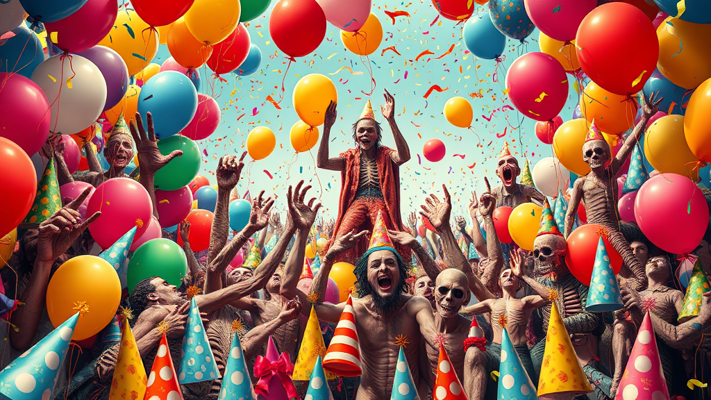 A joyous cacophony, forcefully rendering a dazzling array of meticulous minutiae and extravagant garnishes, foreground freighted with a multitude of objects and emblems, each contributing to an overall aura of jubilation and lightness. Balloons and confetti, streamers and party hats in a dazzling profusion of color and movement, rendered with sloppy, garish color artifacts and a general air of utilitarianism. In the distance, a creeping sense of unease seeps into the proceedings, symbols of morbidity and mutilation tacked awkwardly amidst the revelry: a severed limb here, a withered head there, extra digits and mismatched limbs everywhere. Low-resolution, poorly-drawn, and menacingly grotesque, the image defies coherence, a confrontation of conflicting ideals in an exercise in bravura excess.