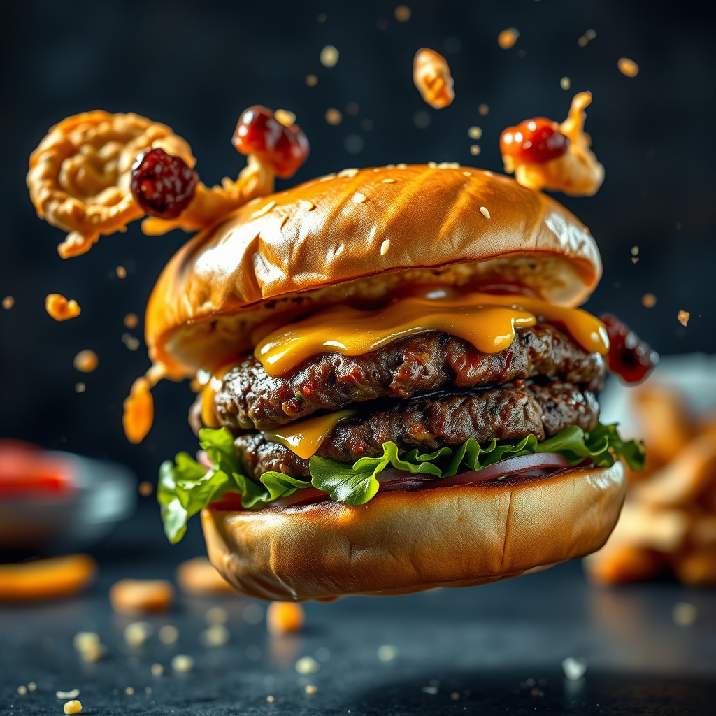 A juicy, delicious burger disassembles in mid-air, capturing the mouthwatering essence in a dynamic and hot promotional photo, showcasing intricate details with HDR quality and a cinematic flair, enhanced and perfected in Adobe Lightroom, highlighting every savory layer in exquisite detail.