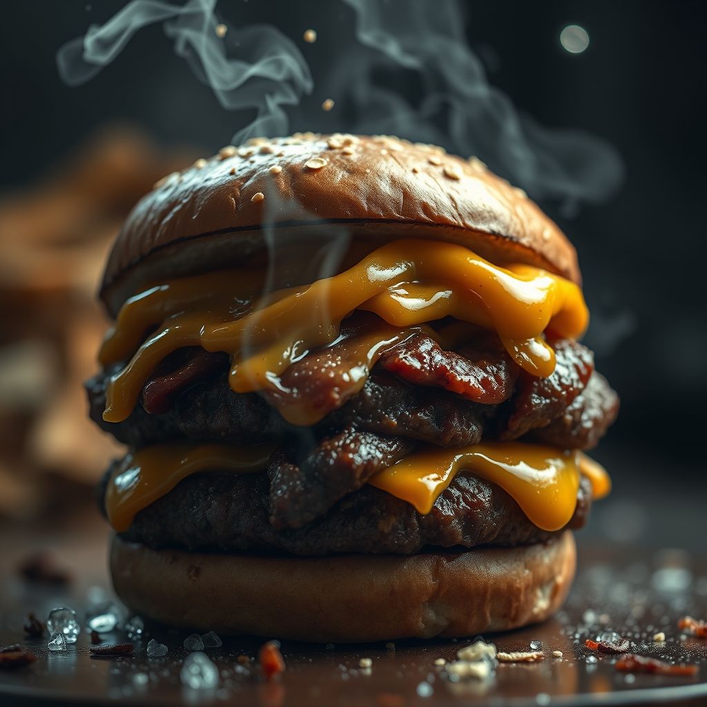 A juicy, mouth-watering burger captured in mid-fall, layers separating to reveal its succulent, steaming contents; a tantalizing, high-definition cinematic shot with intricate textures, captured in Adobe Lightroom, showcasing every delectable detail for a compelling promotional visual.