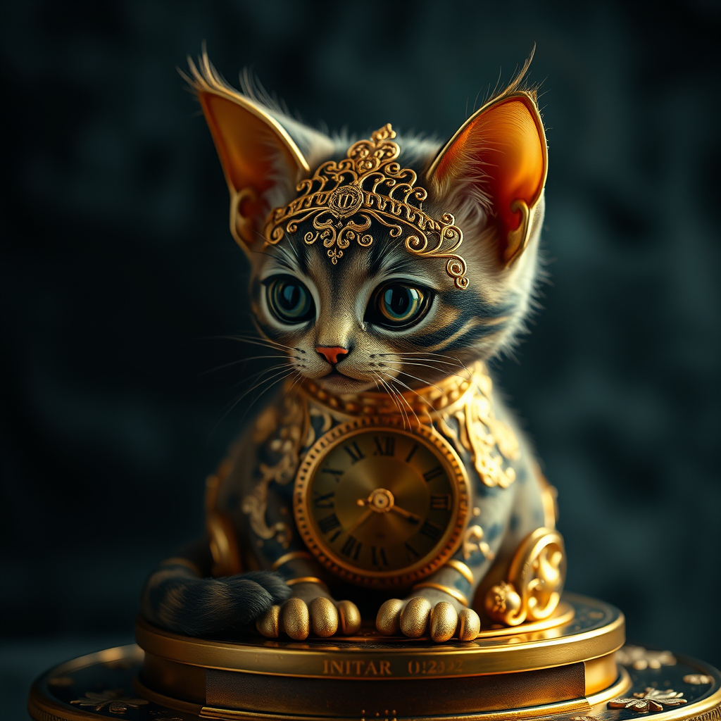 A kitten crafted from intricate gold clockwork, adorned with delicate golden filigree, set against a mysterious, abstract dark backdrop. The scene is rich in chiaroscuro, showcasing high detail and photorealism. Its hyper-realistic style is enhanced by a sense of dynamic acceleration, captured in stunning 8K, HD, and super-resolution. The image possesses a cinematic quality with a long exposure effect, emphasizing the intricate craftsmanship and intricate detailing, all presented in a coherent 1:1 aspect ratio.