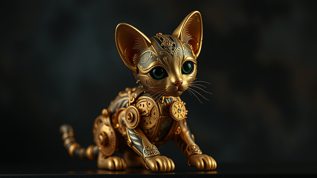 A kitten crafted from intricate golden clockwork and delicate gold filigree, set against a mysterious dark abstract background, exuding chiaroscuro lighting with high detail. Emphasizing photorealism and hyper-realism, the scene captures a sense of acceleration in 8K, HD, and super resolution, with a cinematic feel and long exposure effect. The composition maintains a balanced 1:1 aspect ratio, highlighting the exquisite craftsmanship and dynamic essence of this mechanical feline.
