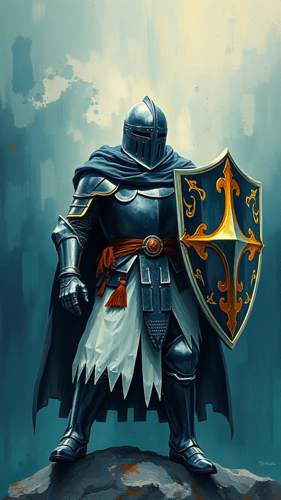 A knight clad in dark white and bronze armor, adorned with a flowing cloak, stands valiantly with a shield, surrounded by an aura of adventure pulp. The scene is infused with mottled textures reminiscent of Yup'ik art, reflecting a masterful use of heavy palette knives, creating a dynamic interplay of light indigo and green hues. The knight's silhouette strikes a harmonious blend of tradition and modernity, capturing the spirit from the 1970s to the present, infused with stylized elegance.