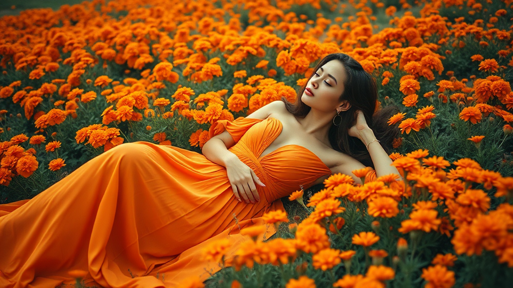 A Kodak-inspired snapshot of a stunning fashion model in a flowing burnt orange dress, reclining gracefully amidst a rich bed of marigold flowers, capturing a warm, nostalgic essence with the vibrant hues blending seamlessly into a scenic, dreamy landscape in 3:4 aspect ratio.