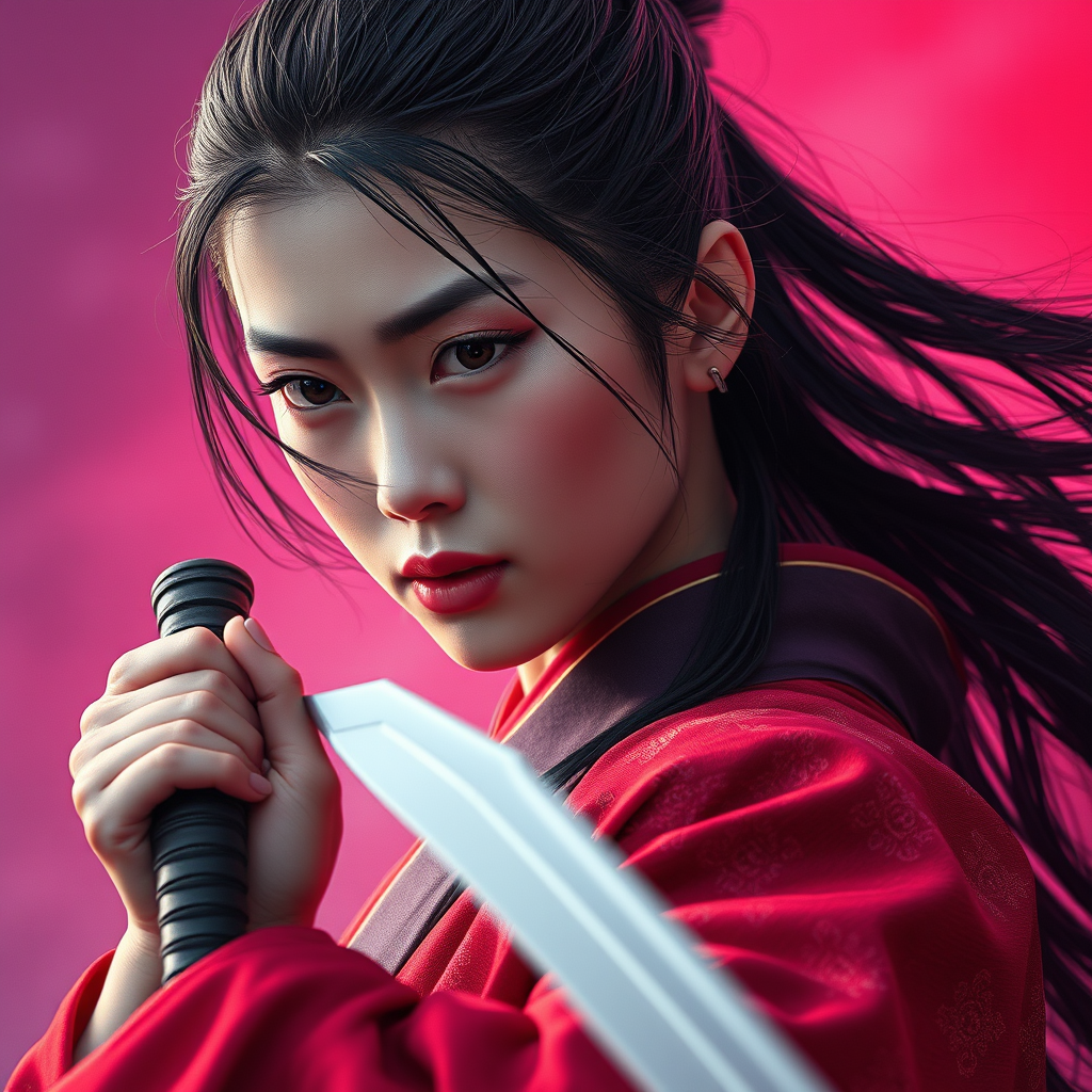 A Korean warrior woman stands poised with a gracefully curved sword held firmly in front of her, her expressive face revealing intense determination, set against a backdrop of soft violet and deep crimson hues. The scene is inspired by the intricate detail of sōsaku hanga prints, capturing a moment reminiscent of a historical epic. The close-up composition utilizes photorealistic, cinematic quality achieved through UE5 and octane rendering techniques. Her traditional attire flows with the gentle breeze, subtly blending with the colored light, creating a harmonious balance between strength and elegance.