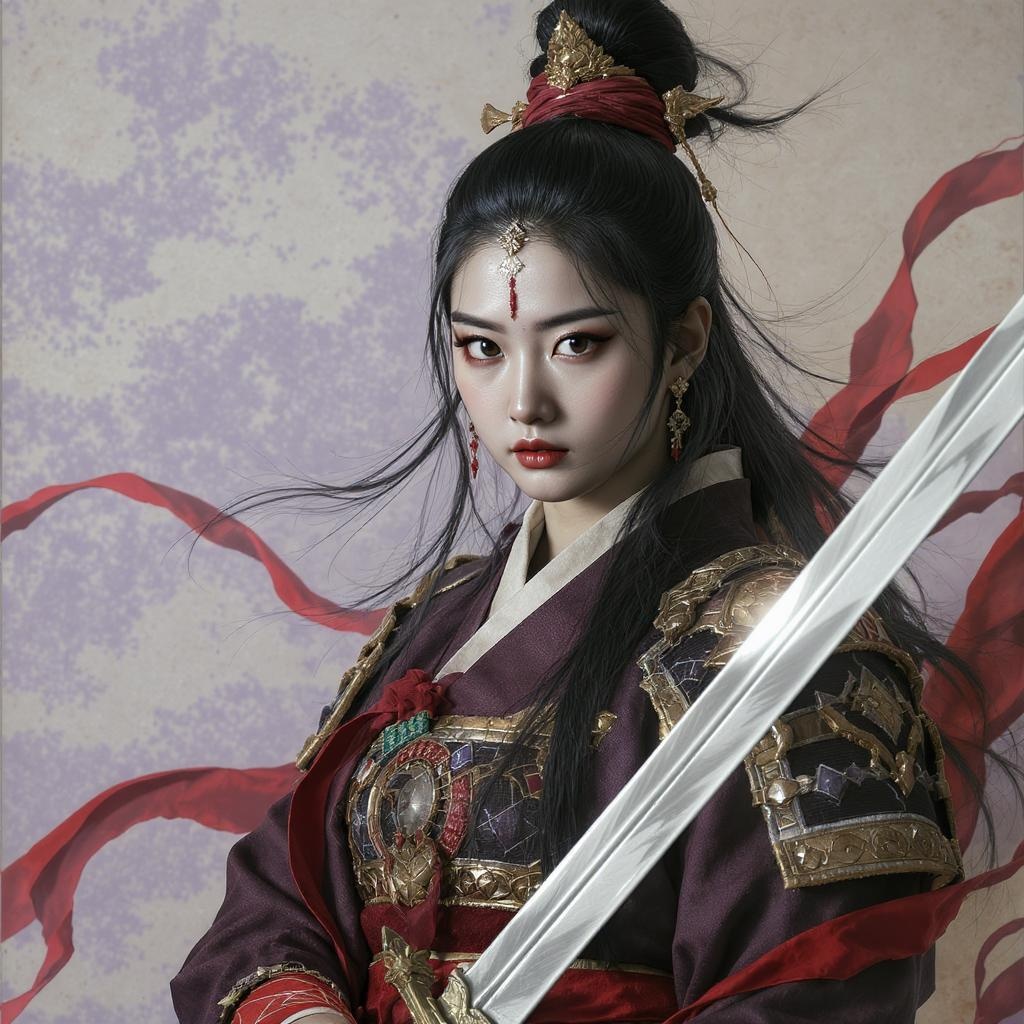 A Korean warrior woman stands poised with a grand sword held firmly in front of her, set against a backdrop of light purple and red hues, inspired by the vivid style of Sandara Tang. Her expressive facial features capture a blend of determination and grace, reminiscent of a historical drama. The scene is richly detailed, akin to a sōsaku hanga woodblock print, yet rendered with photorealistic, cinematic clarity using advanced techniques like UE5 and octane rendering. The focus on her face conveys an intense, movie quality close-up, capturing the mood of a legendary epic.