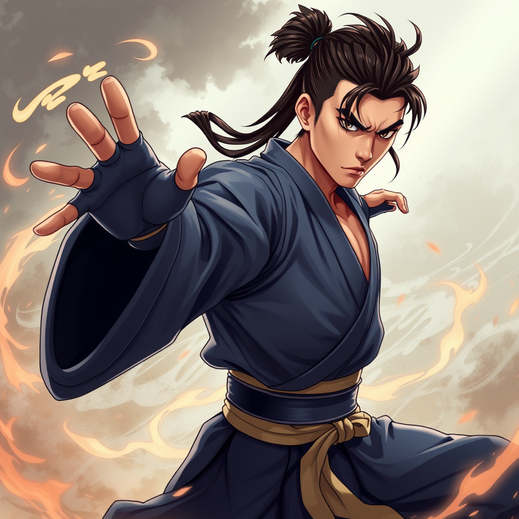 A kung pow character envisioned through anime-inspired design elements, akin to the artistry of Bernardo Strozzi, exuding a grandeur of scale with a palette of light navy and dark bronze. The character embodies a zen-inspired aura, with features reminiscent of Ron Embleton's style, enriched by realistic details. Allow for creative modifications to enhance the core essence.