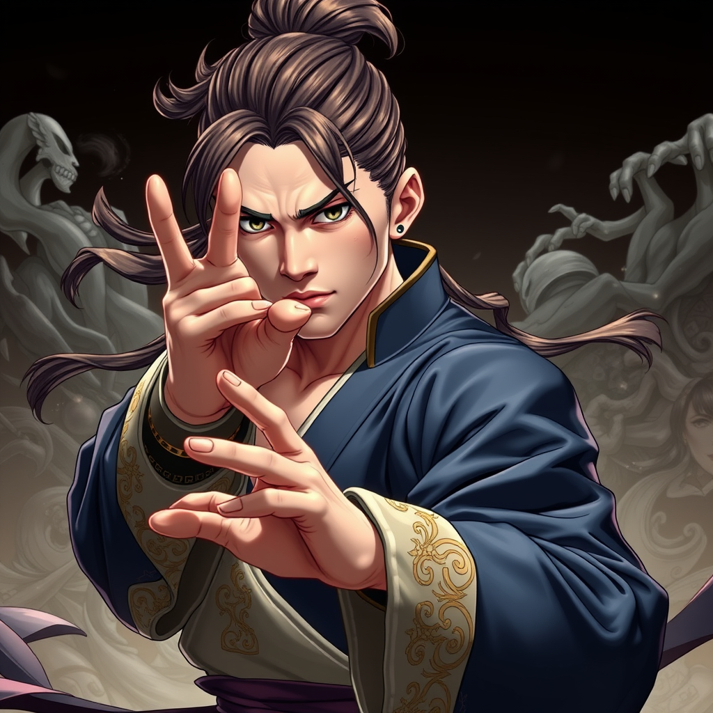 A kung pow character with anime-inspired design featuring the artistry of Bernardo Strozzi, presented with grandeur of scale in light navy and dark bronze tones, infused with zen-inspired aesthetics and realistic details reminiscent of Ron Embleton's style, maintaining a harmonious blend of elegance and power, detailed with fluid martial arts poses and intricate textures, embodying a balance of calm and intensity.