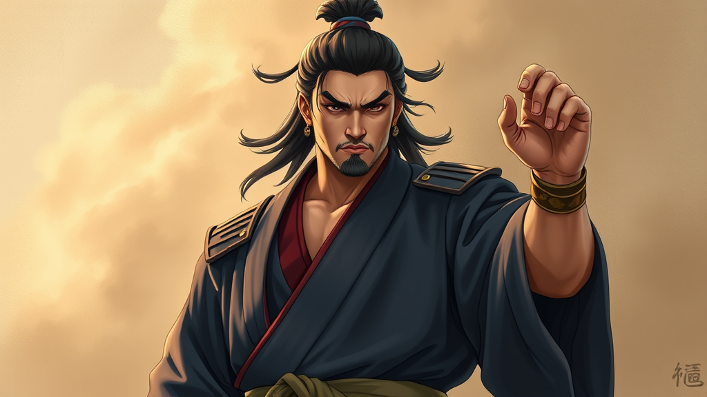 A Kung Pow-inspired character rendered in anime-inspired character design featuring intricate details reminiscent of Bernardo Strozzi, with a grandeur of scale. The character's attire blends light navy and dark bronze hues with Zen-inspired elements, embodying serenity and strength. Designed with realistic details, evoking the style of Ron Embleton, the character stands poised, exuding an aura of discipline and wisdom.