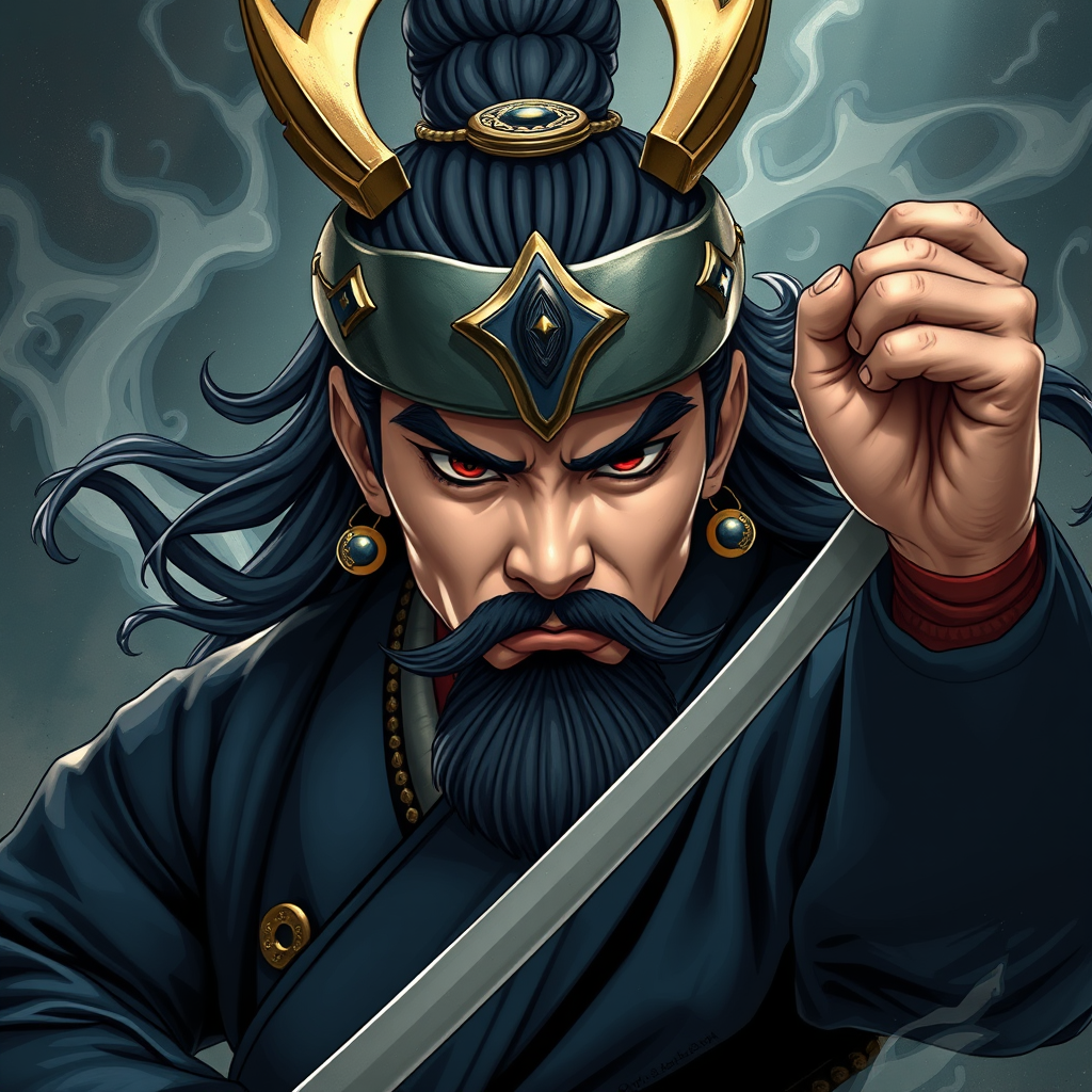 A Kung Pow-inspired character styled like anime designs, captured with the sophistication of Bernardo Strozzi's art, invoking grandeur through a palette of light navy and dark bronze. Influenced by zen philosophy, the character embodies tranquility and strength, infused with the illustrative precision of Ron Embleton's realistic details. This striking image combines the epic scale and artistry, seamlessly blending elements into a cohesive and visually captivating figure.