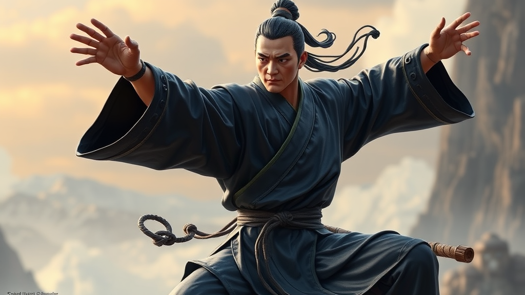 A kung pow-inspired character with anime-influenced design, embodying the grandeur of scale akin to Bernardo Strozzi's work; adorned in light navy and dark bronze attire that echoes Zen aesthetics. The figure is detailed with realistic touches reminiscent of Ron Embleton's style, featuring a dynamic pose that captures both serenity and power, set against a backdrop that hints at an expansive, mystical landscape.