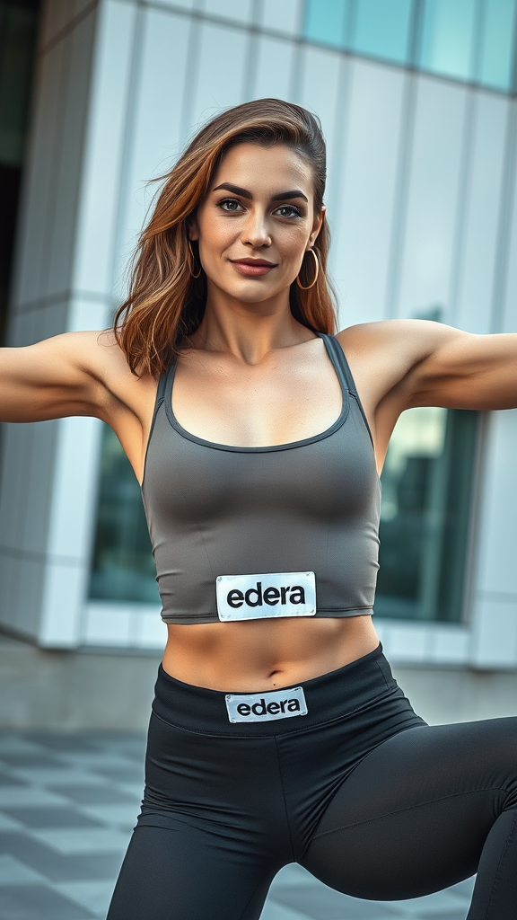 A large format street fashion photo captures a 24-year-old Montenegrin-Italian woman, embodying classic Hollywood beauty with a warm, inviting expression. She has light beige skin adorned with subtle freckles across her cheeks and shoulders, with clearly visible skin pores and texture. Her deep-set, triangular light brown eyes are framed by long, elegant eyelashes. Her hair is styled in feathered layers, with a soft auburn hue that complements her tapered, peak-shaped eyebrows, accentuating her delicate facial features. Her body is athletic, showcasing a tight, flat stomach with defined muscle grooves, small breasts, and toned abs, reminiscent of a female bodybuilding style. She wears a sleek upper body outfit with an "edera" label on the front, leaving her midriff visible. Her lower body clothing, fitting yet stylish, complements her ensemble. Positioned on the left side of the frame by the rule of thirds, she strikes a dramatic pose, extending one leg forward with her arms wide, exuding energy and celebration. The backdrop features a modern subway station with polished metal panels, glowing LED signs, and long descending escalators, adding a futuristic urban vibe. Bright daylight filters through a botanical garden, casting lush greenery and vibrant colors, enhancing her outfit with a fresh, lively aura. Soft, natural lighting, inspired by the style of Yu Ngiang, bathes her figure.