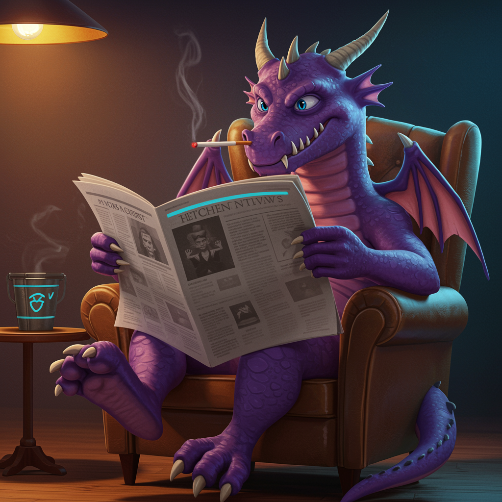 A large menacing purple dragon with gentle, kind blue eyes sits comfortably in a retro-style armchair, spikes adorning its back. With a smoldering cigarette delicately held between its fangs, it flips through a futuristic newspaper. The scene is bathed in cinematic lighting, accentuating the dragon's contrasting aura of intimidation and warmth, embodying a fusion of classic cartoon charm with a quirky twist.