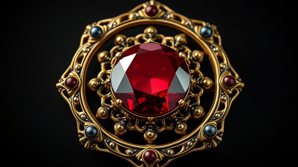 A large, ornate brooch featuring a radiant crimson ruby at its center, designed as a coveted game item. The brooch is framed by intricate gold filigree with subtle silver accents, exuding a dark fantasy allure. Its circular form is both elegant and mysterious, capturing the mystique of untold adventures.