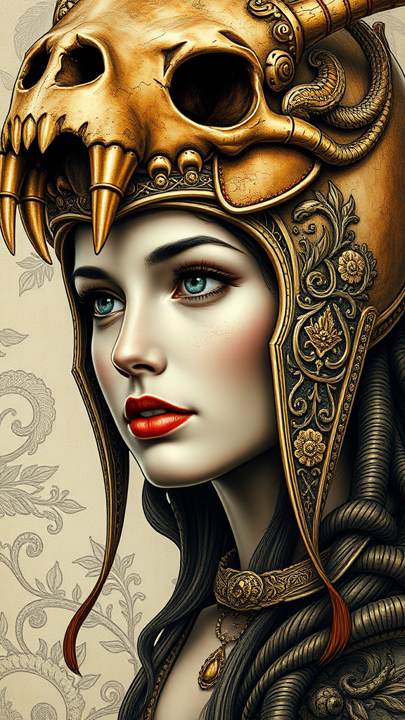 A large-scale portrait of a woman adorned with a skull helmet, capturing the intricate style of Pinturicchio. The scene exudes a sense of mythical allure, combining elements of elaborate dragon art and ornate detailing. Her expression reflects strength and wisdom, with light bronze and bronze hues enriching the composition. The background is a harmonious blend, highlighting the engraved line-work reminiscent of Jessie Arms Botke's naturalistic designs. The entire piece possesses a sense of movement and life, with subtle creative nuances enhancing the core concept.