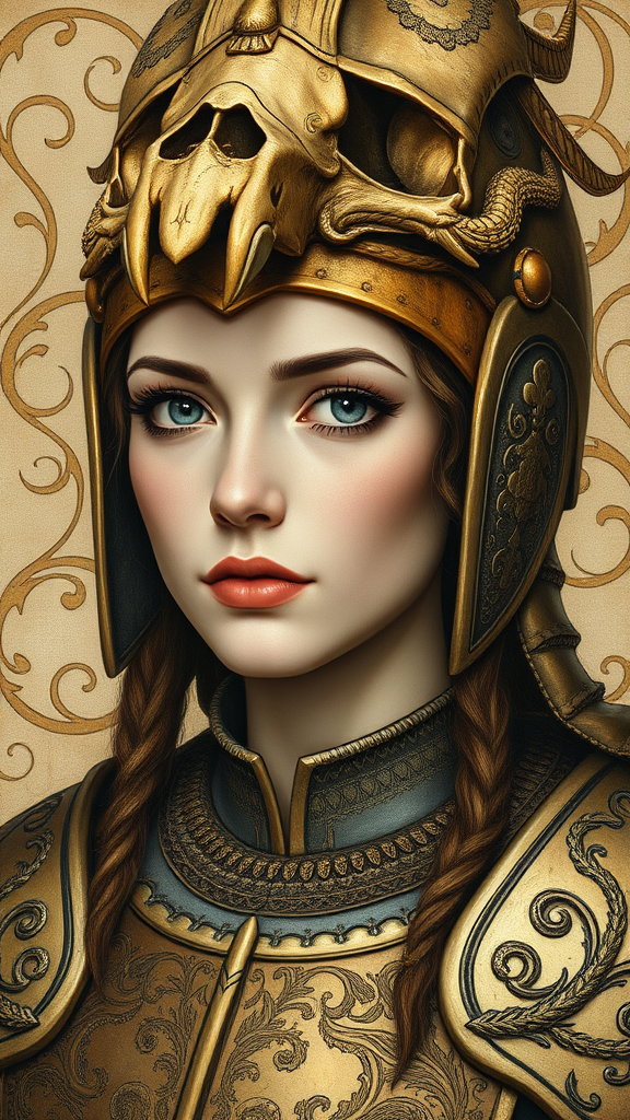A large-scale portrait of a woman adorned with a skull helmet, inspired by the style of Pinturicchio, featuring intricate, ornate detailing reminiscent of dragon art. Her armor is embellished with light bronze and bronze hues, with engraved line-work that mirrors the elegance of Jessie Arms Botke's art. Her expression is serene, set against a backdrop of swirling, mythical motifs. The helmet's design includes subtle draconic influences, with delicate scales and flowing lines, adding a touch of fantasy to her regal appearance. The overall composition is both powerful and graceful, capturing the essence of an ancient warrior imbued with artistic sophistication.