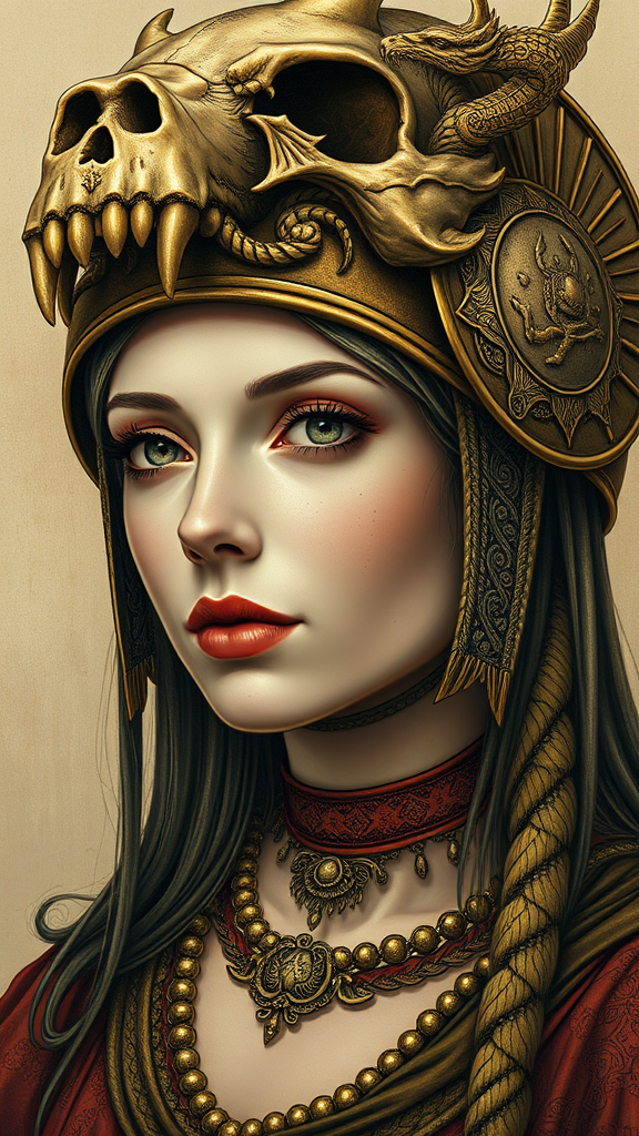 A large-scale portrait of a woman wearing a skull helmet, inspired by the style of Pinturicchio, with intricate dragon-themed art and ornate detailing. The color palette focuses on light bronze and bronze with elaborate, engraved line-work, reminiscent of Jessie Arms Botke’s approach. The composition is dramatic, capturing the elegance and mystique of the subject, with subtle creative elements woven into the design, accentuating her enigmatic presence.