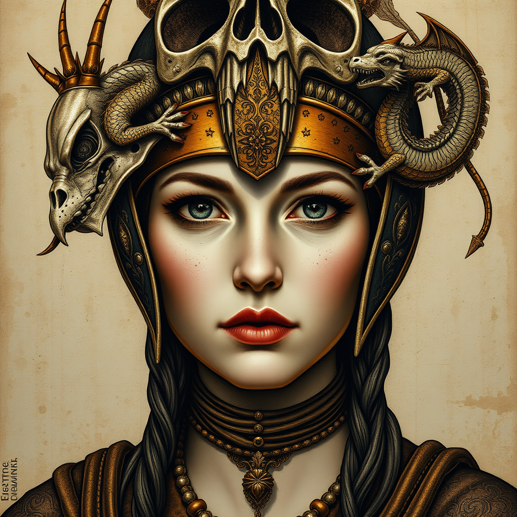 A large-scale portrait of a woman wearing a skull helmet, inspired by the style of Pinturicchio, featuring intricate dragon art and ornate detailing. The artwork is infused with light bronze and bronze hues, showcasing engraved line-work reminiscent of Jessie Arms Botke. The piece captures a blend of Renaissance elegance and mythical allure, with subtle creative twists adding depth and dimension to the composition.