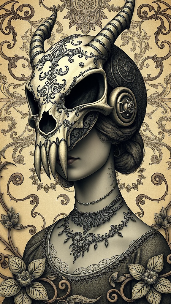 A large-scale portrait of a woman wearing an intricately detailed skull helmet, blending the ornate style of Pinturicchio and dragon art. The piece features light and dark bronze tones with engraved line-work, capturing a sense of elegance and mystique. Her surroundings are adorned with intricate, nature-inspired patterns reminiscent of Jessie Arms Botke's work, accentuating the composition's grandeur. The artwork is set in an ethereal atmosphere with a stylized flair that enhances its mythical essence.