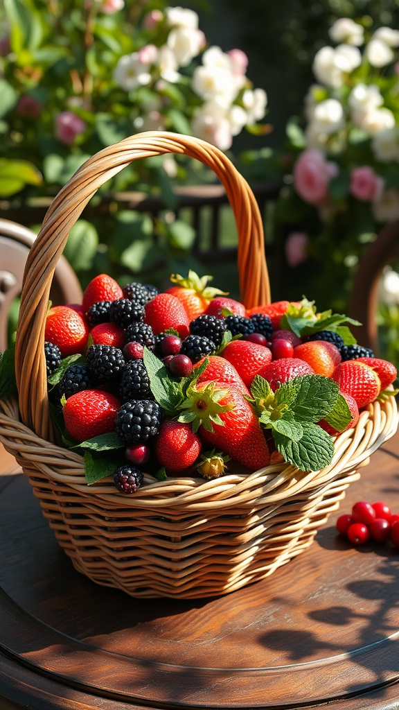 A lavish arrangement of assorted berries, featuring plump strawberries, ripe blackberries, and tart cranberries, carefully placed within an ornate, intricately woven Victorian basket. The display rests elegantly on an antique wooden garden table, surrounded by the lush greenery and delicate blossoms of a vintage Victorian garden. The scene is bathed in warm, dappled sunlight, casting playful shadows that enhance the vivid, natural colors and extraordinary detail of the berries and their surroundings.