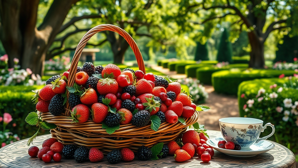 A lavish basket overflowing with ripe strawberries, plump blackberries, and tart cranberries, each fruit rendered with exquisite detail and vibrant colors, sits gracefully on an ornate garden table. The setting is a picturesque Victorian garden, where manicured hedges and blooming flowers provide a lush and elegant backdrop, enhanced by dappled sunlight filtering through the leaves of towering oaks. Nearby, a delicate china teacup rests on a saucer, hinting at an afternoon tea, as a gentle breeze stirs the air, carrying the sweet aroma of blossoms intermingled with the scent of freshly picked berries.