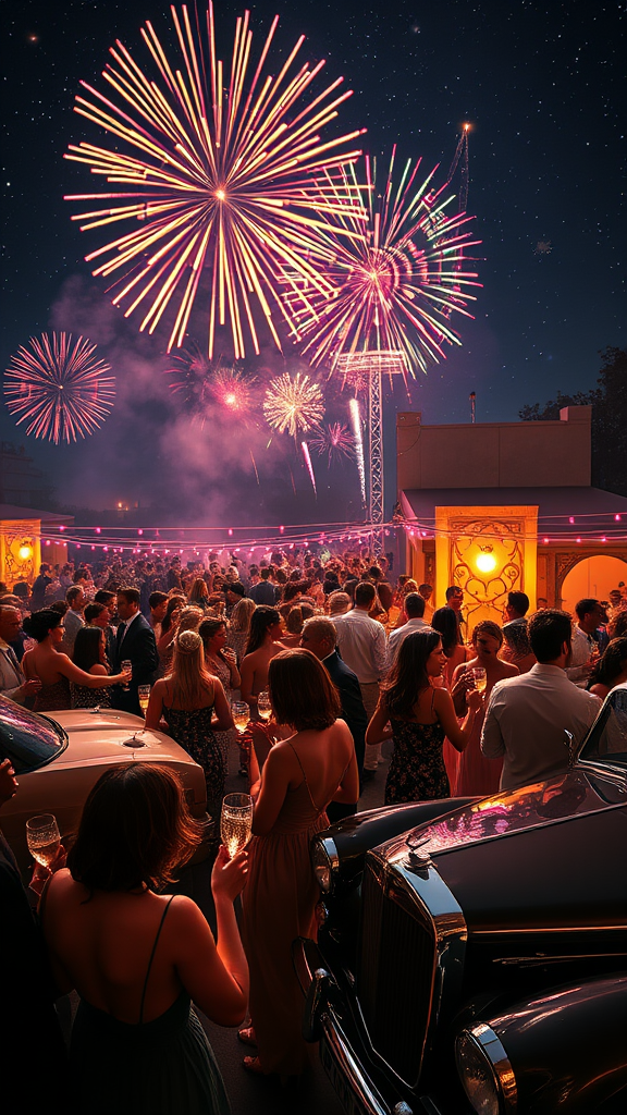 A lavish Great Gatsby-inspired party unfolds under a starlit night sky, where a stylish crowd of elegantly dressed people dance with exuberance outdoors. The atmosphere is electric, illuminated by a symphony of colorful fireworks painting the heavens above. Every detail is captured in stunning clarity, inviting the viewer into a world of opulence and celebration, exuding a timeless allure and vibrant energy. The scene is richly detailed, with the glimmer of moonlight playing off sleek vintage cars and sparkling champagne glasses in the participants' hands, conveying a sense of decadent prosperity and joy.