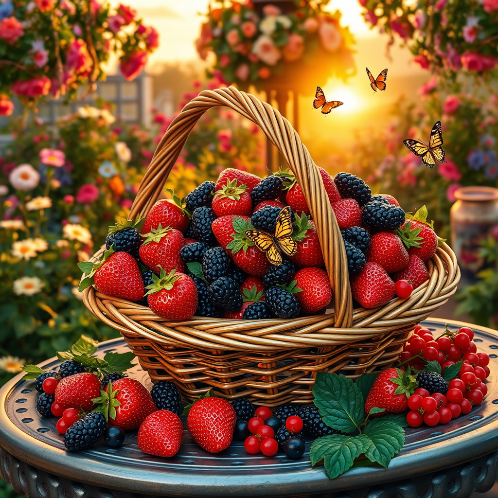 A lavish Victorian basket brimming with an assortment of berries – luscious strawberries, plump blackberries, and tart cranberries – intricately detailed and vividly realistic, resting on an ornate garden table. The backdrop features a charming Victorian garden, resplendent in colorful blooms and lush greenery, bathed in the golden glow of a setting sun. Delicate butterflies flit amongst the flowers, adding a touch of whimsy to the vibrant scene.