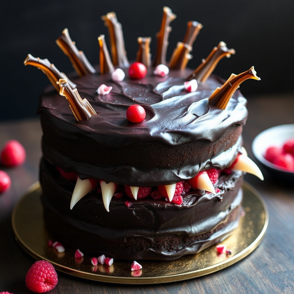 A layered cake with dark chocolate frosting evokes the mischievous essence of critters, with tufts of licorice resembling their wild fur, while sharp, candy-coated teeth peek from the sides, and vibrant red-tinted raspberry filling suggests a playful, dangerous sweetness lurking within.