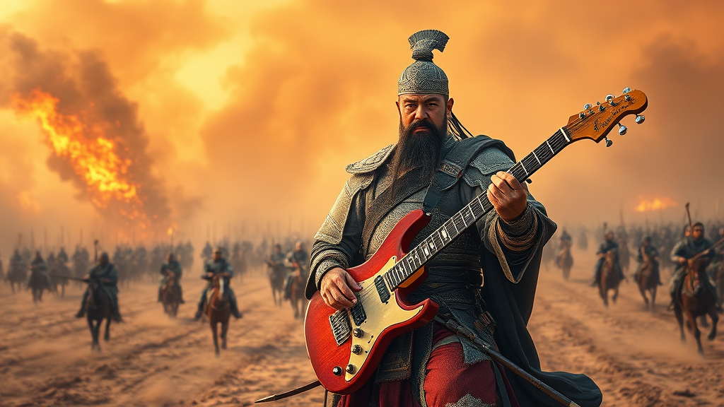 A legendary general from the Qin Dynasty stands proudly in a vast, dust-laden battlefield, wielding an electric guitar like a powerful weapon. The air is thick with smoke from distant fires, as an army of warriors on horseback charges through the scene behind him. The general's armor gleams under a fiery sky, his expression a mix of fierce determination and artistry. The composition captures the moment in hyper-realistic detail, bringing to life the dramatic contrast between ancient tradition and modern influence in this panoramic portrait.