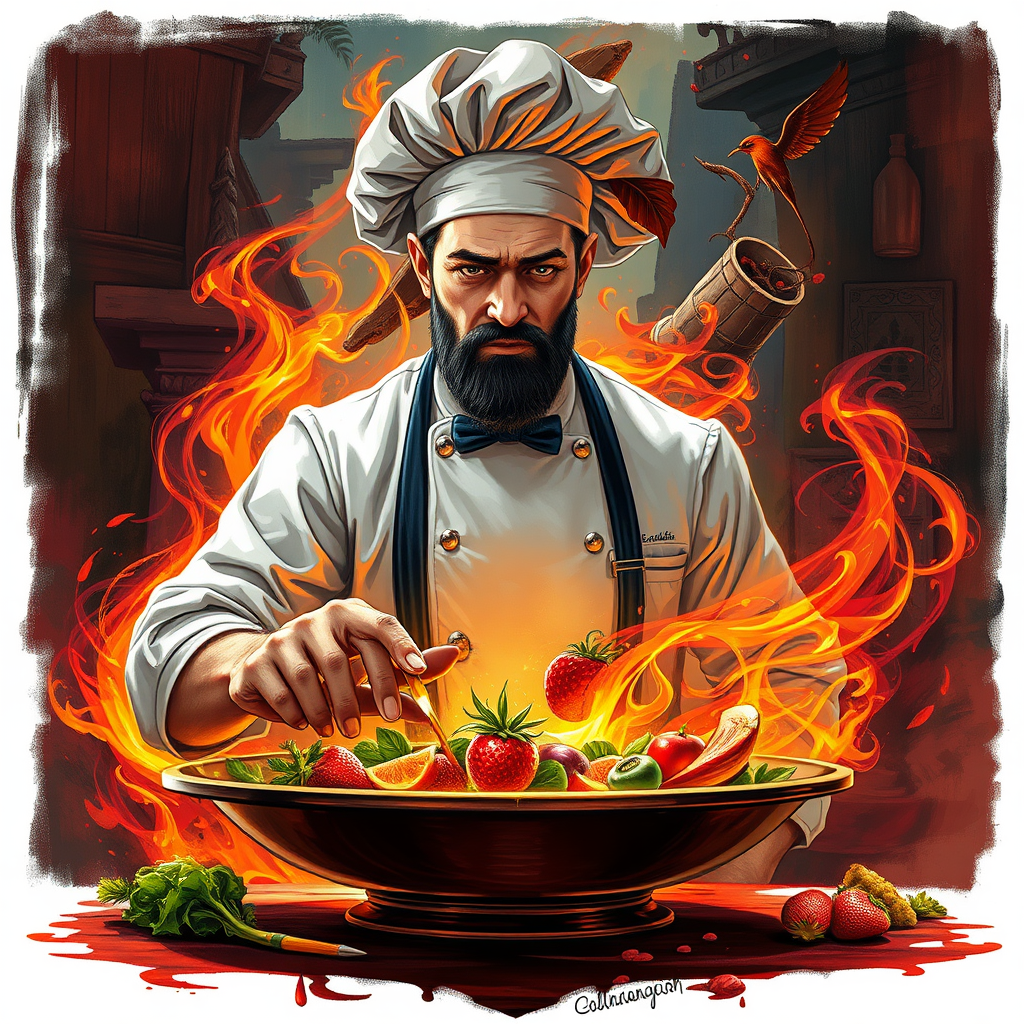 A legendary male French chef, renowned as the greatest culinary artist in the world, master of culinary magic. His culinary creations are a feast for the eyes and taste buds, blending fantasy and artistry. His world is a canvas painted with the vibrant and ethereal styles of Greg Rutkowski, Loish, Rhads, Ferdinand Knab, Makoto Shinkai, Lois van Baarle, Ilya Kuvshinov, Rossdraws, and Tom Bagshaw. The chef's domain is one of sharp focus and smooth elegance, where symmetry and creativity intertwine seamlessly in a harmonious dance of gastronomic brilliance.