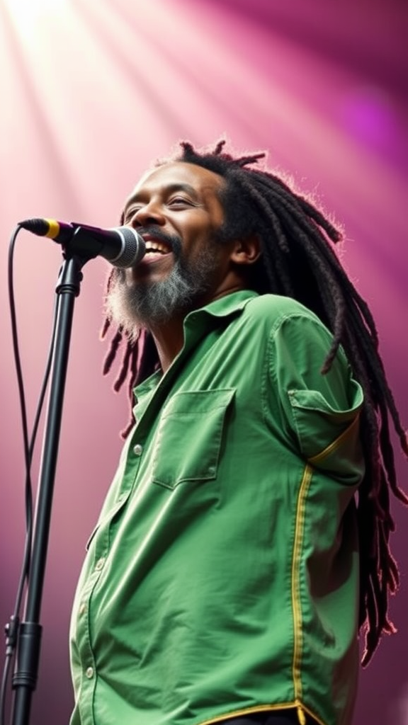 A legendary reggae musician radiating peace and unity, known for his soulful voice and profound lyrics that blend the spirit of Rastafarian culture with universal messages of love and resistance.