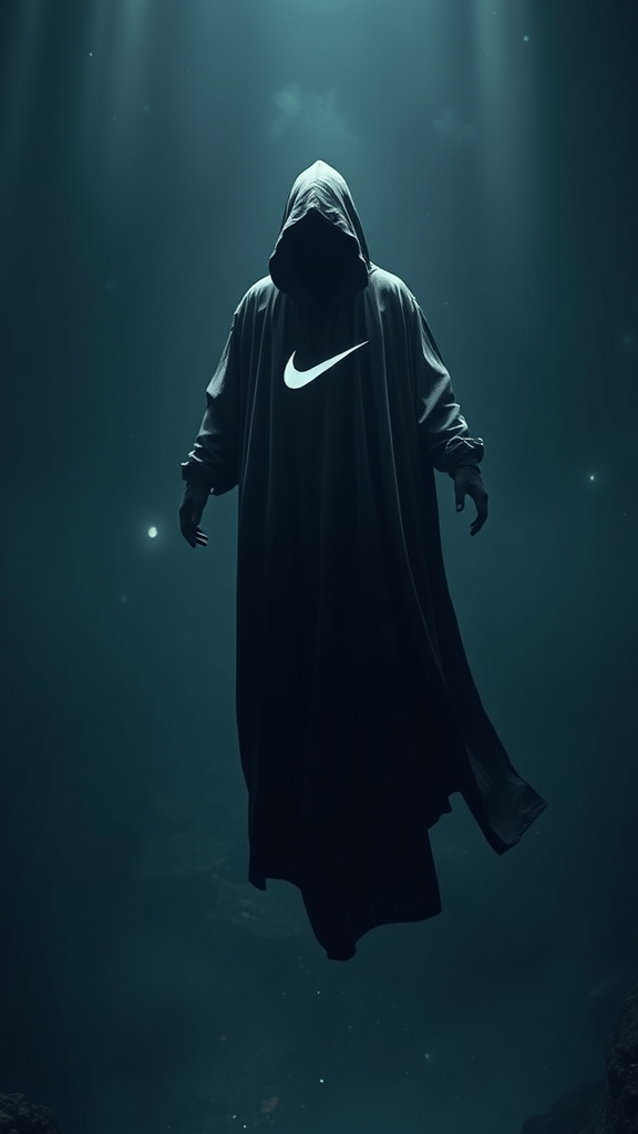A levitating figure cloaked in darkness, adorned with a subtle Nike swoosh, hovers over an expansive void that opens into infinity, rendered in stunning 3D octane clarity. The high-detail scene, captured in 8k resolution, showcases dramatic volumetric lighting that casts ethereal shadows, enhancing the mystical aura. Subtle hints of Nike air max design weave into the fabric of the cloak, seamlessly fusing sport and mystery. The Nike logo discreetly pulses with an otherworldly glow, amplifying the sense of innovation and limitless potential.