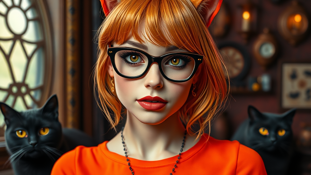 A life-size figure of a goth-inspired Velma from Scooby-Doo, adorned in an orange top, exuding a dark, gothic mood with bold eye makeup and stylish eyeglasses. The scene captures the essence of kitsch with golden age aesthetics, reminiscent of Jessica Drossin's style, merged with a touch of Kieron Gillen's narrative flair. Inspired by Dima Dmitriev's work, the backdrop features catcore elements, adding whimsy to the mysterious ambiance.