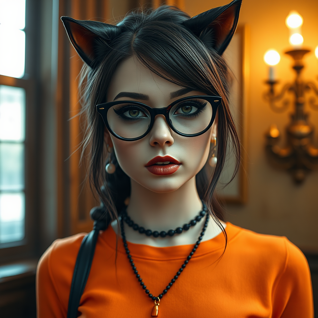 A life-size figure of a woman embodying a fusion of goth girl aesthetics with a nod to Velma from Scooby-Doo, adorned in eye-catching dark eye makeup and sporting chic eyeglasses. Her ensemble includes an iconic orange top reimagined with goth style flair, set against a golden age inspired backdrop. Influenced by the artistic styles of Jessica Drossin, the slightly whimsical touch of kitsch, and hints of Dima Dmitriev's and Kieron Gillen's creativity, the scene evokes a unique blend of historical charm and modern edge. The atmosphere is enriched by subtle catcore elements, creating a visual narrative that's both intriguing and stylish.
