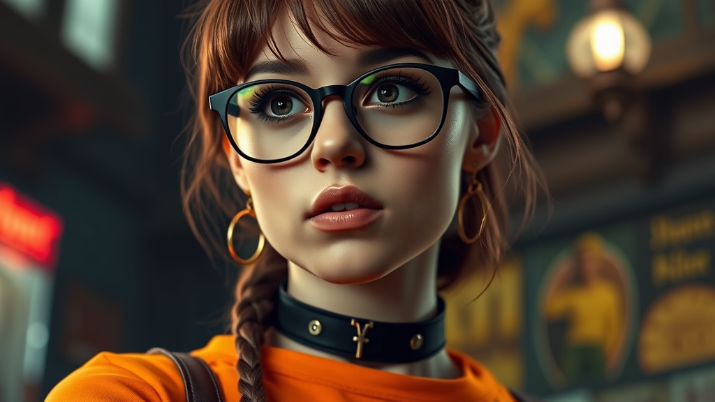 A life-size figure of a woman wearing eyeglasses and an orange top, blending the goth girl aesthetic and Velma from Scooby-Doo. Her look is enhanced with dark eye makeup, embodying a goth style mood. Imagined in the artful style of Jessica Drossin and Dima Dmitriev, this scene captures kitsch and golden age aesthetics, sprinkled with the narrative flair of Kieron Gillen. The ambiance whispers of catcore charm, creating a unique fusion of classic and alternative elements.