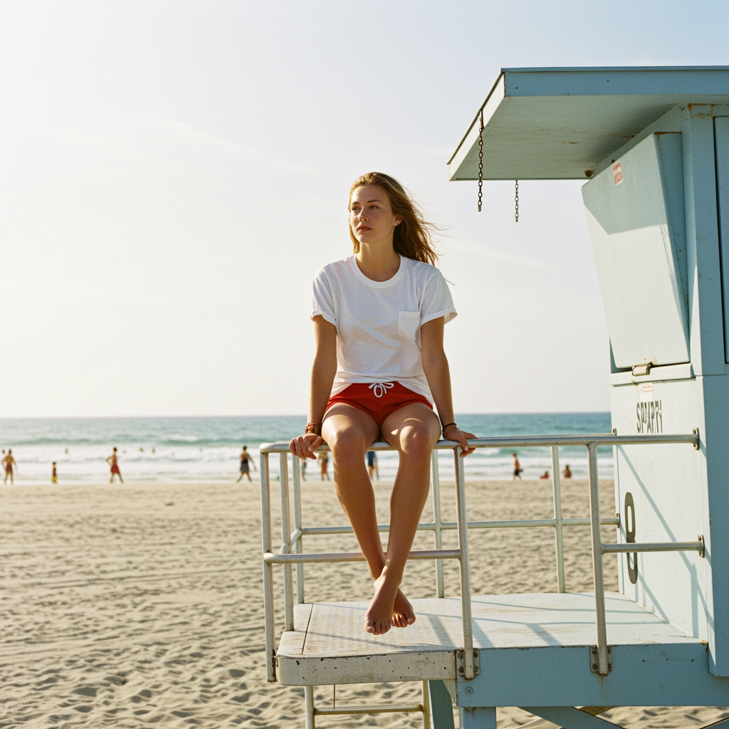A lifeguard girl sitting confidently on a bright white lifeguard tower, dressed in a simple white shirt and vivid red shorts, under a radiant sun, overseeing the bustling beach. Her natural hair flows with the breeze, and her keen eyes, matching her natural palette, scan the sands and waves. The scene exudes a warm, sunny ambiance with expertly balanced colors and a striking depth of field, capturing the vibrant details of the beach day. Soft shadows add texture to the image, enhancing the natural beauty of the setting where she stands watch, embodying both vigilance and serenity.