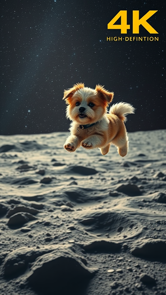 A lifelike depiction of a furry dog soaring gracefully across the lunar landscape in high-definition 4k, capturing the essence of space exploration against the backdrop of the vast, star-studded cosmos.