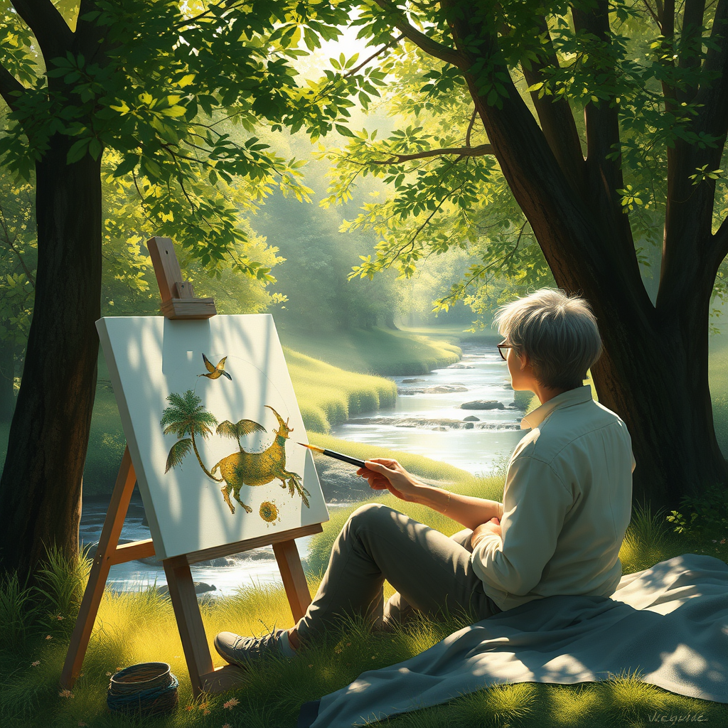 A lifelike depiction of a person creating art on a canvas amidst a tranquil natural landscape, with sunlight filtering through the lush trees, casting gentle shadows. The artist, focused and relaxed, is surrounded by the soft sounds of nature, with gentle breezes rustling through the leaves and a distant stream flowing peacefully, capturing the essence of serenity and creativity in harmony with the environment.