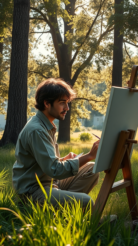A lifelike depiction of a person engrossed in painting a canvas amidst a tranquil natural landscape, the soft sunlight filtering through tall trees casts dappled shadows on the grass, a gentle breeze rustling the leaves, the artist's focused expression highlights their connection with the serene environment, the canvas capturing the vibrant hues of the surrounding scenery.