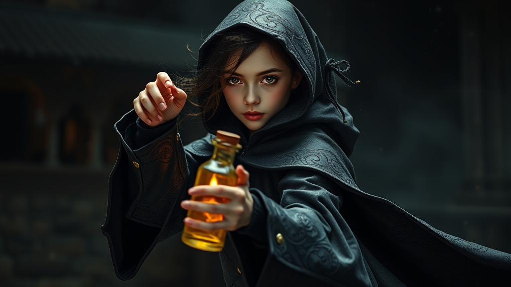 A lifelike depiction of a petite and slightly eerie young sorcerer captured mid-motion, her entire body engaged in a fluid dance-like pose, rendered in stunning slow motion. She is adorned in a richly detailed dark leather cloak brimming with intricate patterns. In her delicate hand, she clutches a mysterious, toxic spell bottle, as if conjuring from it. The setting unfolds against a dark and atmospheric universe, exuding a moody ambiance. This digital masterpiece is presented in ultra-high definition, 8k, showcasing sharpness with intricate detailing. Her face and eyes reveal meticulous craftsmanship, with detailed pupils that bring her expression to life. The scene boasts three-dimensional realism, enriched with finely rendered shadows, styled with inspiration from Chao Teng Zhao, to create a photorealistic, breathtaking vision of dark fantasy.