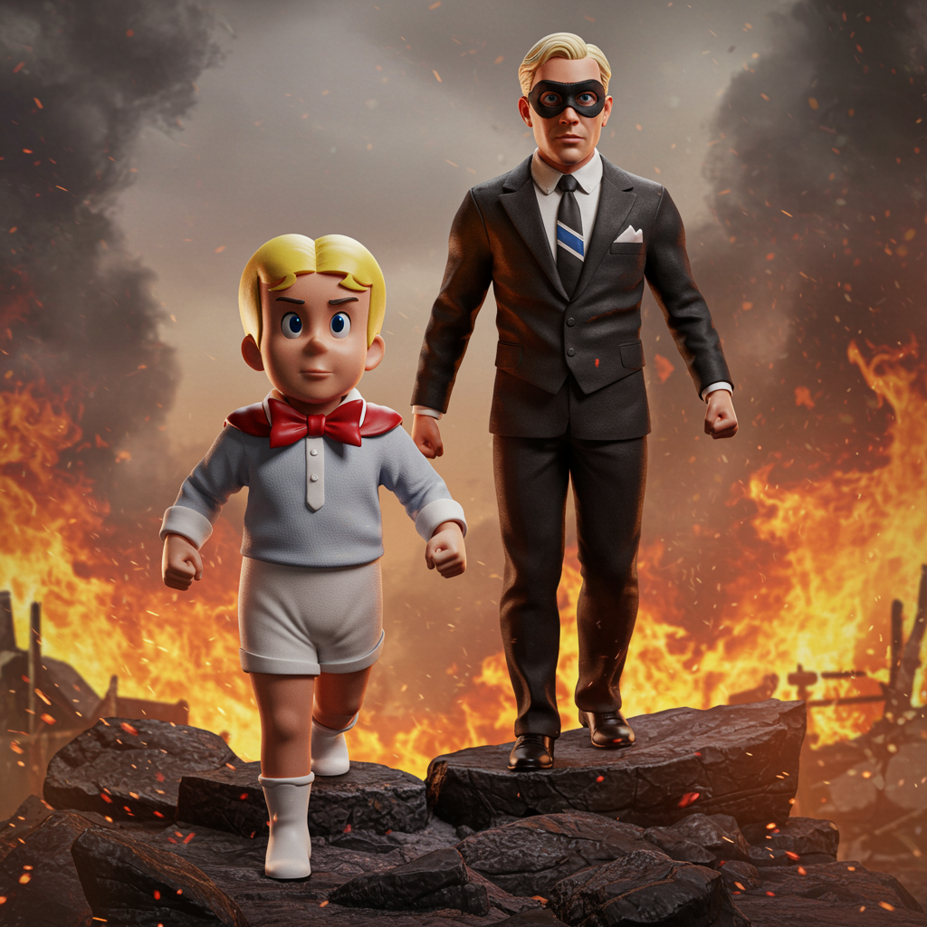 A lifelike full-body portrait captures a very blond-haired, Richie Rich-inspired male character and his steadfast butler, reminiscent of Cadbury from the comics, reimagined as powerful superheroes. Rising from the ashes on jagged rocky terrain, they confront an unseen villain with stern, resolute expressions. Their intense gazes meet the viewer's, set against a background of smoldering ruin. The image is crafted with sharp focus and extreme detail, showcasing intricate textures and realistic features. The muted palette enhances the scene's emotional depth, while soft lighting highlights their forms, infusing the digital painting with a subtle warmth. The composition is rendered in 8k, ensuring every detail, from their superhero costumes to the charred landscape, is richly portrayed, creating an emotionally profound and visually arresting work of art.