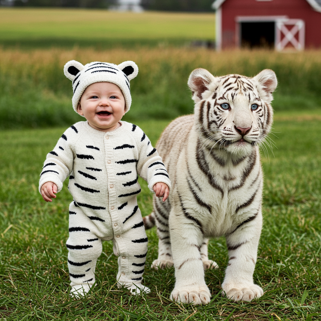 A lifelike, high-definition image features a joyful baby and a young white tiger standing side by side, both looking directly at the camera. The baby, with a gleeful smile, is dressed in a cozy white outfit adorned with intricate black stripes that mimic the striking fur pattern of the white tiger. The ensemble is completed with an adorable hat featuring tiny tiger ears. Both the baby and the tiger are of comparable size, creating a charming visual symmetry. They are set against the backdrop of a vibrant farm, with lush green fields and a rustic red barn adding depth and detail to the scene. The photorealistic style of the image captures every fine texture, from the softness of the baby's outfit to the sleek, elegant fur of the tiger, immersing the viewer in this enchanting moment. Subtle enhancements include a gentle breeze rustling through nearby tall grass and a sunbeam illuminating the duo, adding warmth and life to the overall composition.