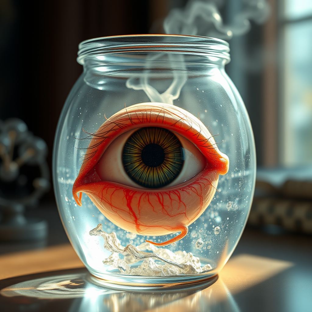 A lifelike human eye is preserved in a crystal-clear jar, surrounded by delicate swirling vapors and shimmering liquid, showcasing intricate details of the iris and veins, reminiscent of the styles of Peter Mohrbacher and Greg Rutkowski. The scene is captured in breathtaking 8k ultra-high-definition, with a photorealistic quality achieved through advanced redshift rendering. The setting features subtle ambient lighting that casts soft reflections and highlights across the glass surface, creating a surreal and captivating atmosphere. The overall composition is finely balanced, with vibrant colors and textures that evoke a sense of wonder and curiosity.