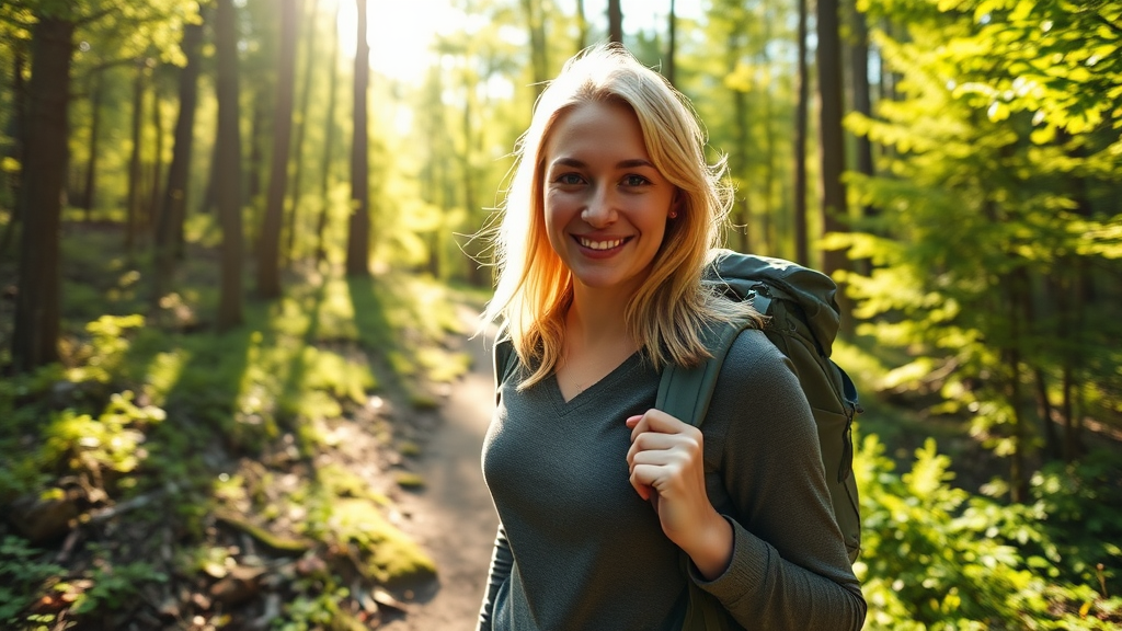 A lifelike image capturing a blonde Instagram influencer on a picturesque hike through sunlit woods, surrounded by vibrant greenery on a warm day. The scene exudes a sense of adventure and connection with nature, with sunlight filtering through the trees creating a pattern of light and shadow on the forest floor. She is dressed in stylish, comfortable attire perfect for a trek, her expression a blend of determination and joy as she documents her journey, the camera subtly catching the charm of the moment. The atmosphere conveys tranquility and the invigorating spirit of the outdoor experience.