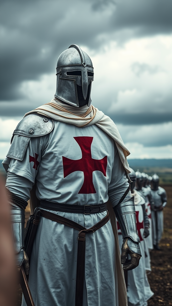 A lifelike image capturing a Templar knight in glistening white armor adorned with a bold red cross on the chest, standing resolutely among a line of fellow knights, ready for battle. The scene is set on a vast battlefield with a dramatic, overcast grey sky looming above, creating an intense atmosphere. The focus is sharp, achieved through depth of field, simulating a capture with a 50mm lens. The knights' armor subtly reflects the muted light, while their helmets, slightly weathered, reveal their readiness and unwavering spirit. In the background, hints of a distant landscape fade into the misty horizon, adding to the somber ambiance.